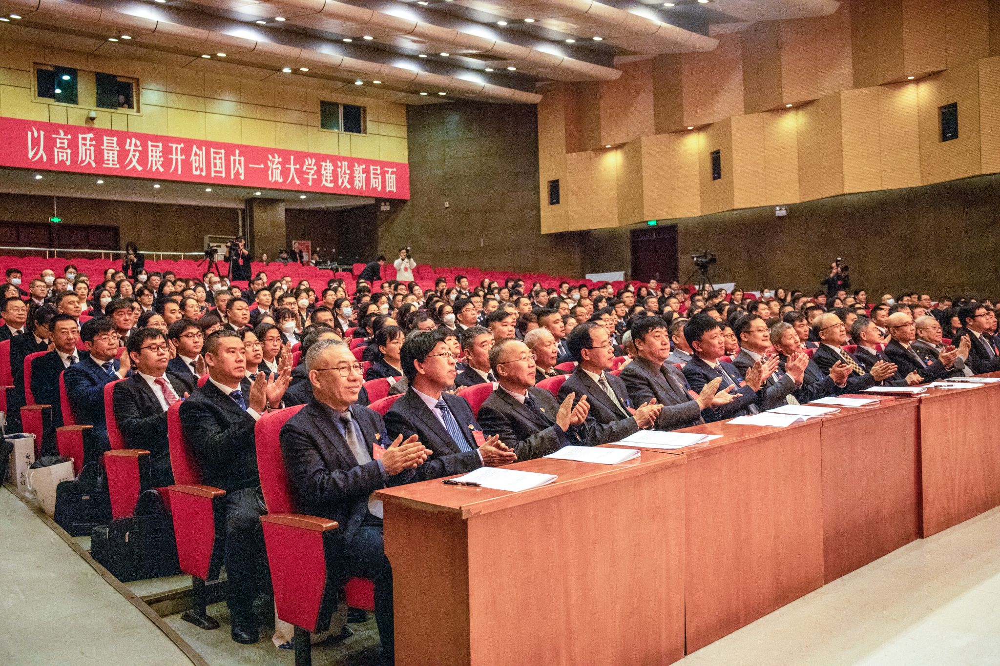 贾玉明最后强调,新的宏伟蓝图已经绘就,新的冲锋号角已经吹响,让我们高举习近平新时代中国特色社会主义思想伟大旗帜,深入贯彻落实党的二十大精神,以永不懈怠的精神状态,一往无前的奋斗姿态,团结带领广大师生,守正创新,锐意进取,向着全面建设国内一流大学的宏伟目标阔步前行!