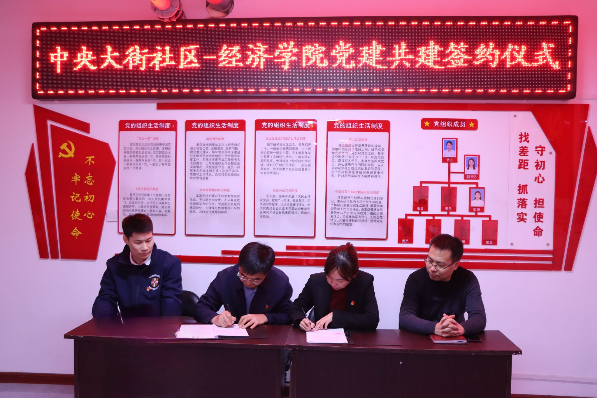 为深入学习贯彻习近平新时代中国特色社会主义思想,全面贯彻落实党的二十大精神,推进基层党组织建设,搭建学院与社区党建共建平台,形成“组织共建、党员共育、服务共抓、资源共享”的党建工作新格局。3月5日下午,经济学院与中央大街社区举行党建共建协议签订仪式。经济学院党总支书记付博文、党总支副书记梁朋,大青街道武装部部长贾春生,中央大街社区党支部书记池杨出席仪式,经济学院师生党员代表、中央大街社区工作人员、社区居民参加仪式。